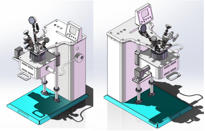 CO2反应系统,共包括四个部分,每一,CO2 通过低温液化后,用高压柱塞泵计量打入反应 部分; 第二,反应部分为,双视窗反应釜,全容积为 550ML,一边打光,一边拍照;第三为 背压系统,保持反应部份恒压,第四,触屏控制系统。
